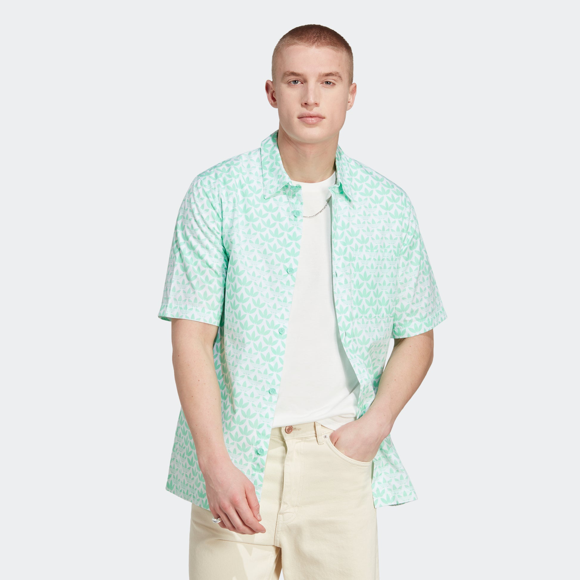 A LAID-BACK BUTTON-UP SHIRT WITH A TREFOIL MONOGRAM PRINT.