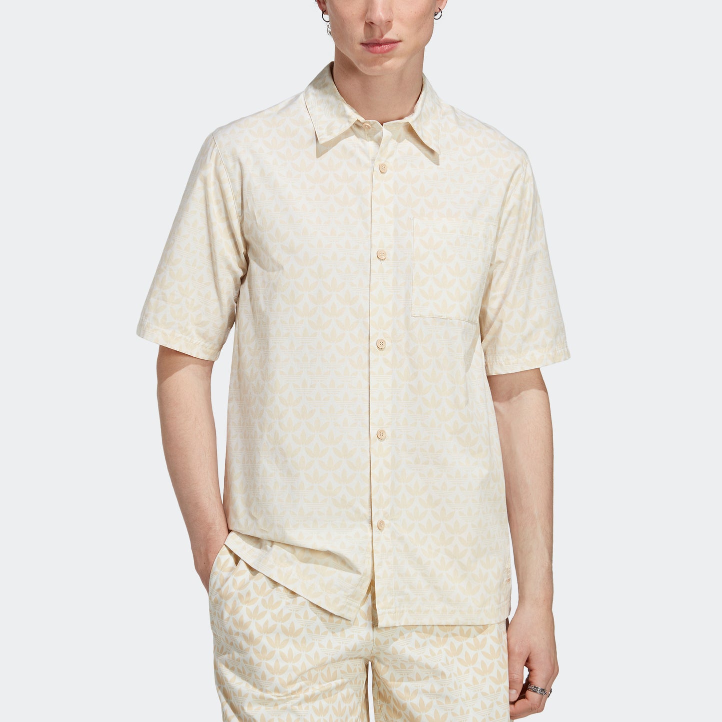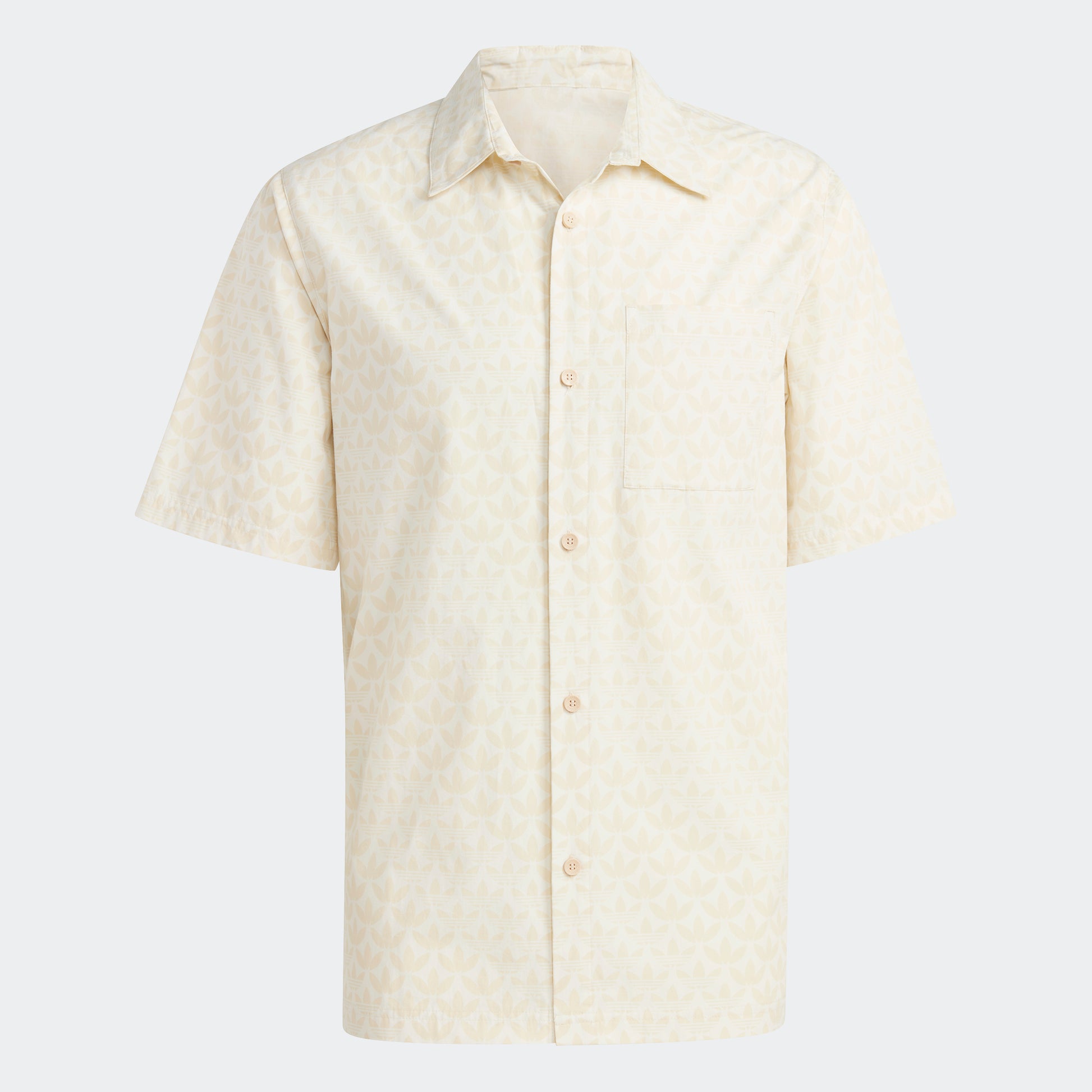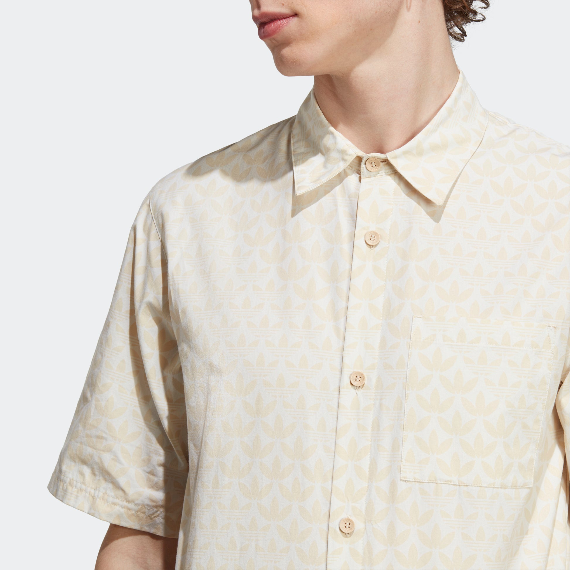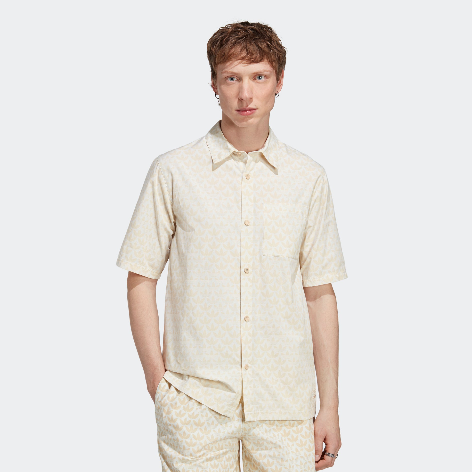 A LAID-BACK BUTTON-UP SHIRT WITH A TREFOIL MONOGRAM PRINT.