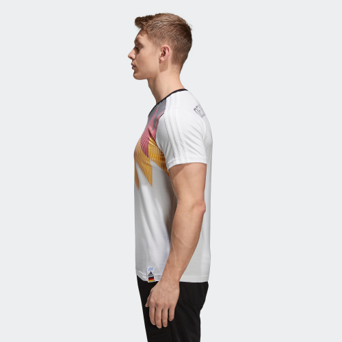This men's football T-shirt is a stylish interpretation of the classic 90s style and upgraded to the iconic German team uniform with novel technology. The back is decorated with the words "Deutschland", with a ribbed V-neck, and the hem is embellished with the German flag.